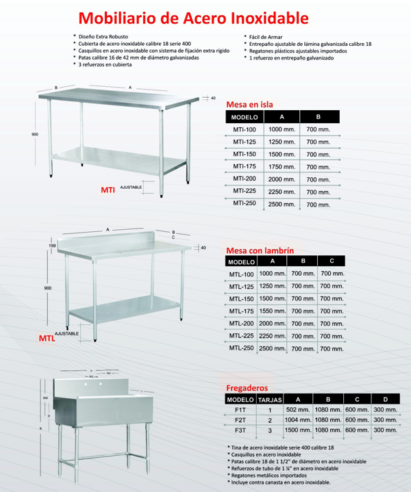 Tenemos casi 100 modelos distintos, para diferentes usos y con diversos ventajas que definitivamente beneficiarán las actividades en su cocina, comedor, restaurante, etc. Dé click en el link de abajo para ver nuestro catálogo de mobiliario de acero inoxidable.